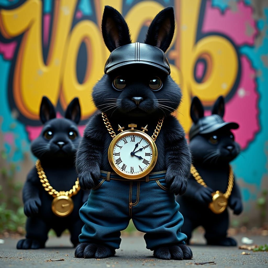 A cinematic portrait of a menacing black bunny gangster with gold jewelry and baggy clothing, standing with puppies near graffiti. The image has a jungle aesthetic with glassy elements, reminiscent of papercraft.