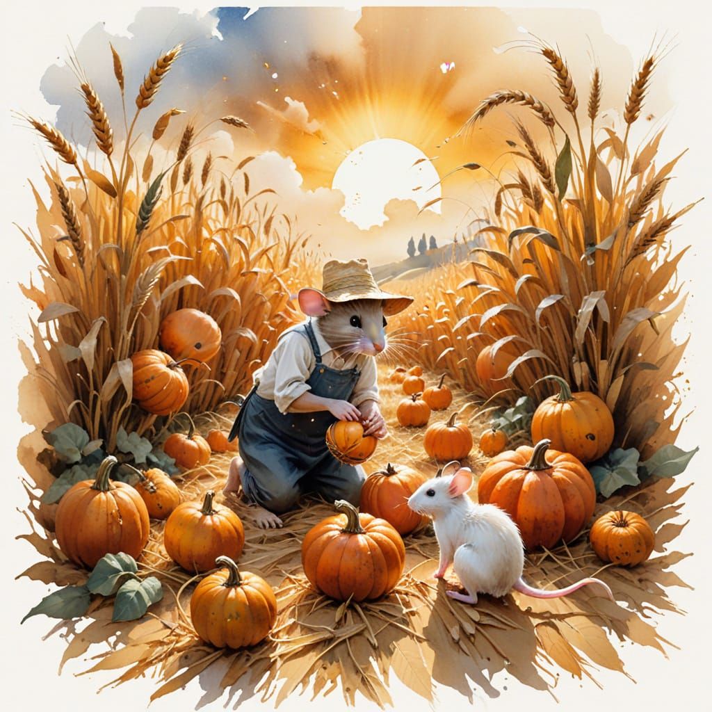 This image shows a mouse dressed as a farmer harvesting tiny pumpkins in a sunlit wheat field. The scene is rendered with warm colors and fine details, evoking a sense of late summer.