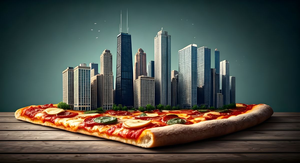 This image depicts a miniature Chicago city made of pizza toppings. The whimsical food art presents iconic architecture rendered in edible ingredients for a playful effect.