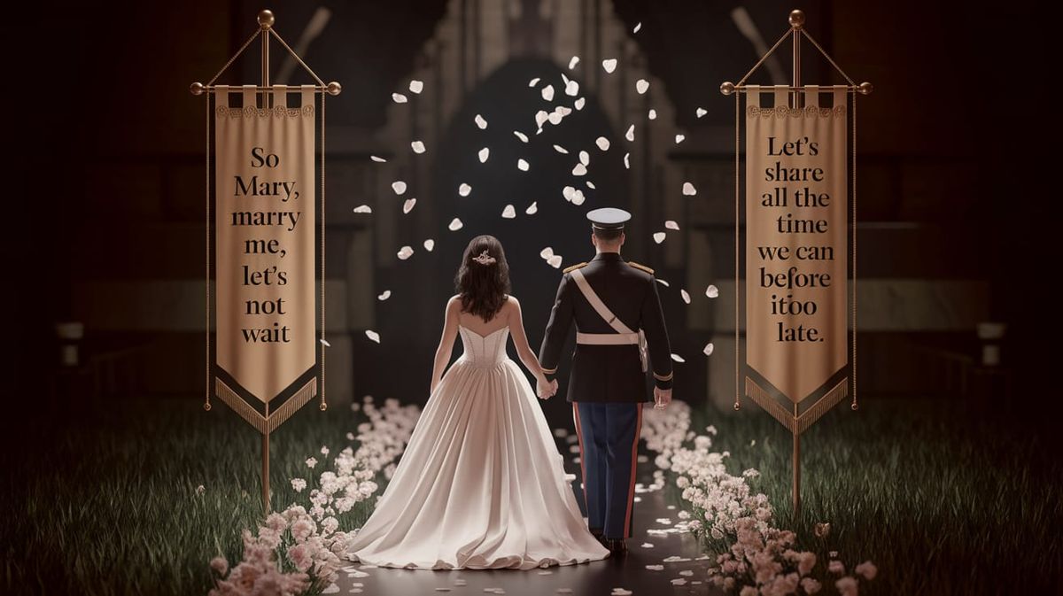 This image depicts a couple's wedding in a dark fantasy setting. The woman in white and the uniformed man walk down the aisle surrounded by flower petals. The scene has rich colors and dynamic lighting.