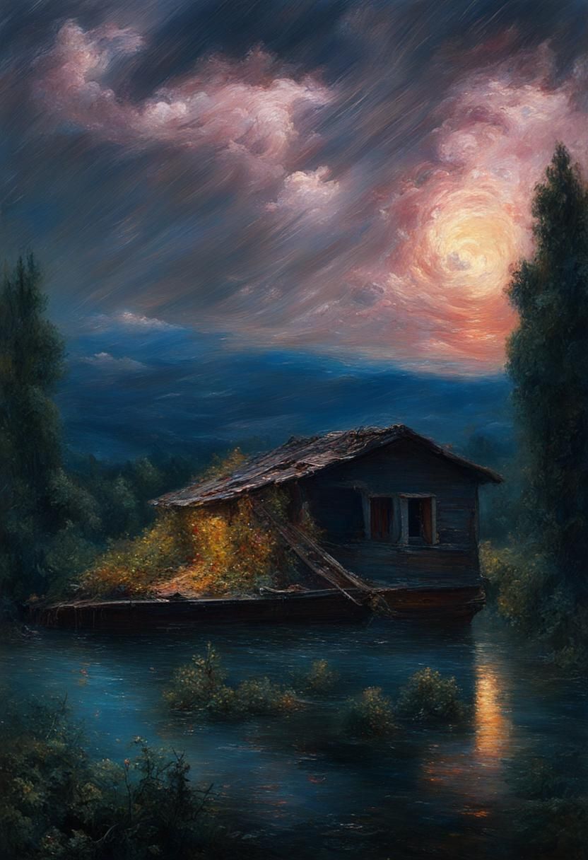 A dramatic painting of rain clouds, rendered in oil with fine detail. The artwork evokes a heat wave through tilt-shift effects, reminiscent of Gustave Doré's style, in an 8k resolution color portrait.