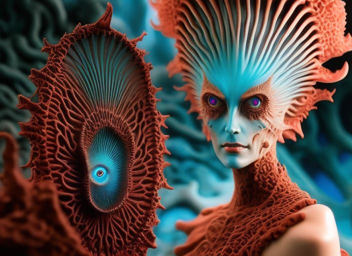 A bizarre image featuring a cyclops grim reaper with gothic and vampire elements. This striking portrait blends dark, colorful, and surreal themes with intricate details, reminiscent of a hyperrealistic 3D rendering.
