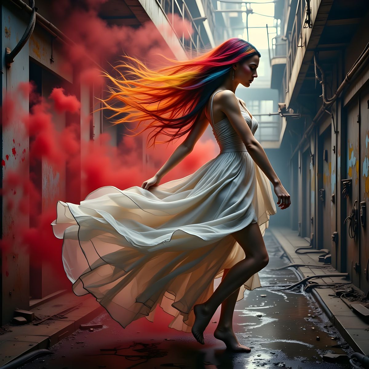 A young woman with vibrant, rainbow-colored hair dances in the decaying interior of a nuclear power plant, surrounded by the remnants of a once-thriving facility.