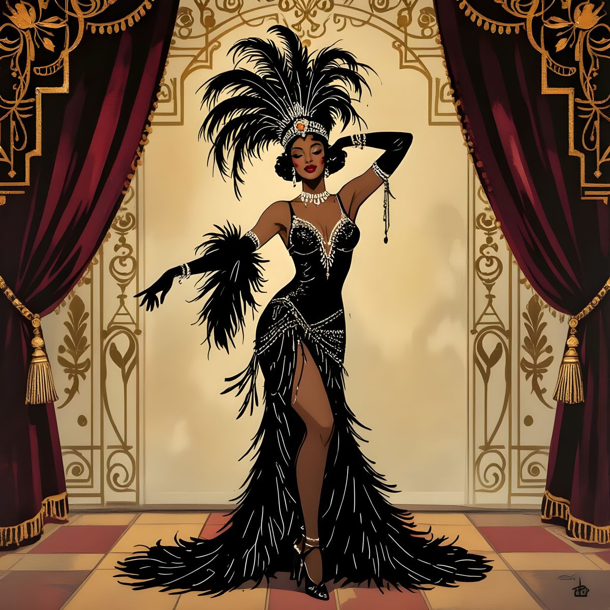 A vibrant image of a cabaret dancer on stage in an Art Deco setting. The scene evokes Toulouse-Lautrec, using bold colors and expressive brushstrokes to enhance the drama and elegance.