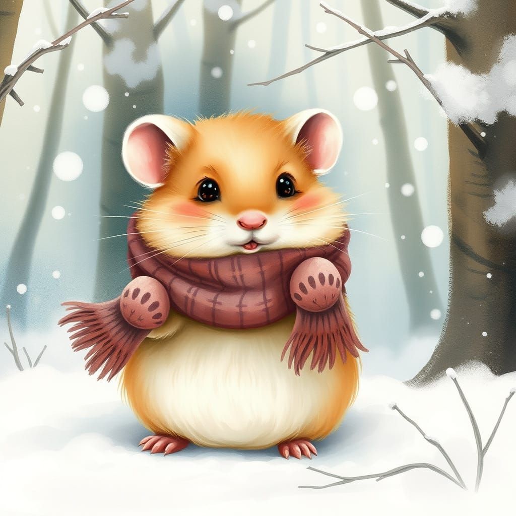 This image shows a charming hamster playing in a snow-covered forest, its fur fluffed up against the cold, with delicate watercolour brushstrokes and a soft, gentle colour palette reminiscent of classic children's book illustrations.