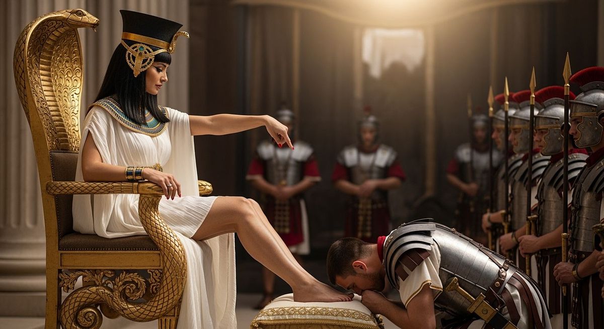 This image shows an Egyptian queen on a cobra-shaped throne, Roman legionnaires kneeling before her. Captured in sharp focus with natural lighting and a bokeh effect, this image has a photorealistic aesthetic.