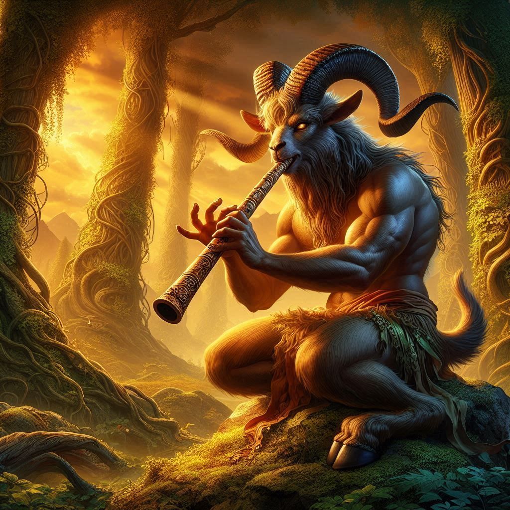Thanks to Norandi @Norandi for the prompt. ππβ€οΈ Prompt : The god Pan, a majestic satyr with goat-like features and a robust build, sits majestically on a rocky outcropping amidst a lush, vibrant ancient Greek forest, surrounded by twisting vines and gnarled tree trunks, the golden light of a dying sun casting long shadows across the landscape. With a mischievous glint in his eye, Pan holds a intricately carved wooden pan flute to his lips, his fingers deftly covering the holes as he prepares to unleash a wild, primal melody.