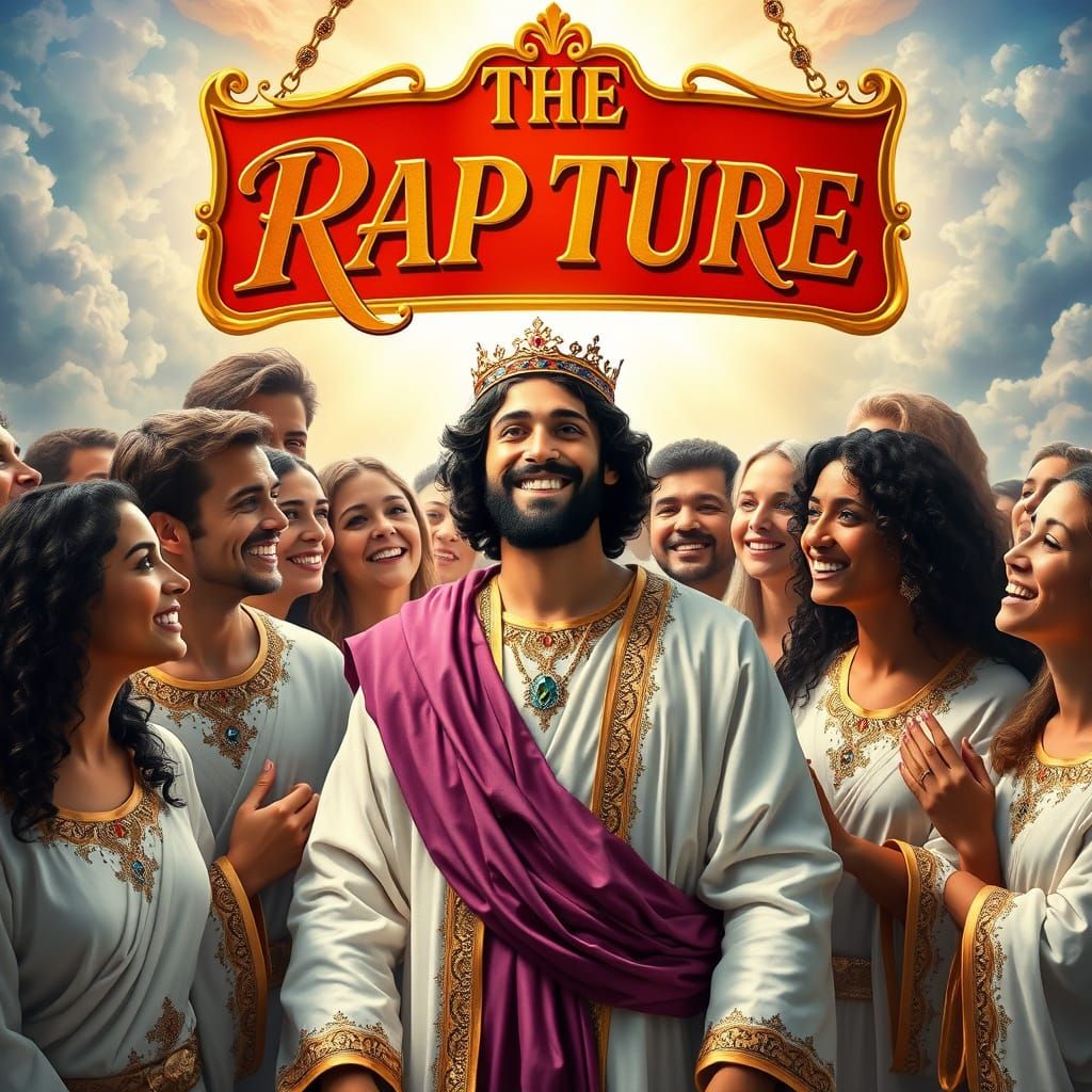 This image depicts a vibrant celebration in Heaven, with diverse individuals gathered around Jesus, surrounded by an ethereal backdrop and ornate golden lettering, evoking the styles of Fra Angelico, Pre-Raphaelite, and Byzantine art with a touch of digital flair.