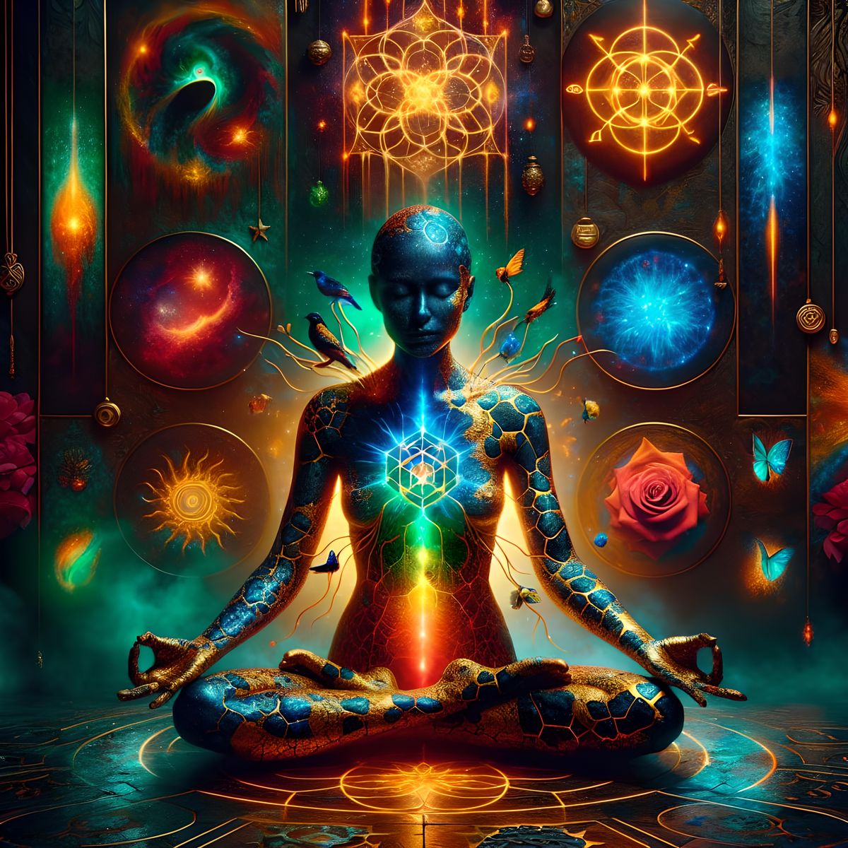This image shows a goddess meditating at an indoor rave, surrounded by neon art and sacred symbols. Kintsugi-style gold repairs highlight cracks in her form, revealing natural and mystical phenomena in surreal, photorealistic detail.