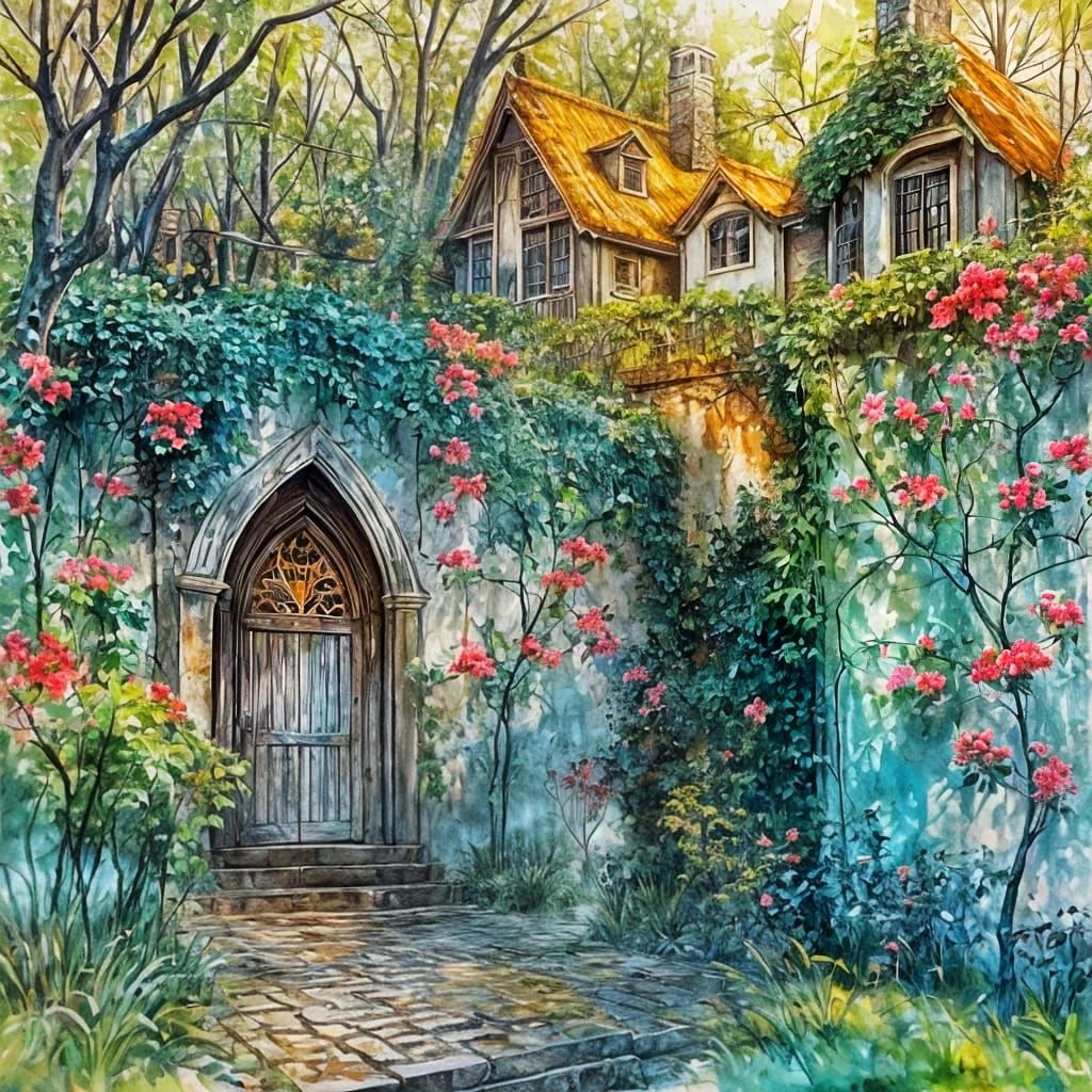 A breathtaking enchanted hobbit village filled with many small, charming, moss-covered cottages with large roynd doors. puffy clouds. lush meadow & woodland area. tranquil. captivating. colorful. fantasy, fairytale, ...