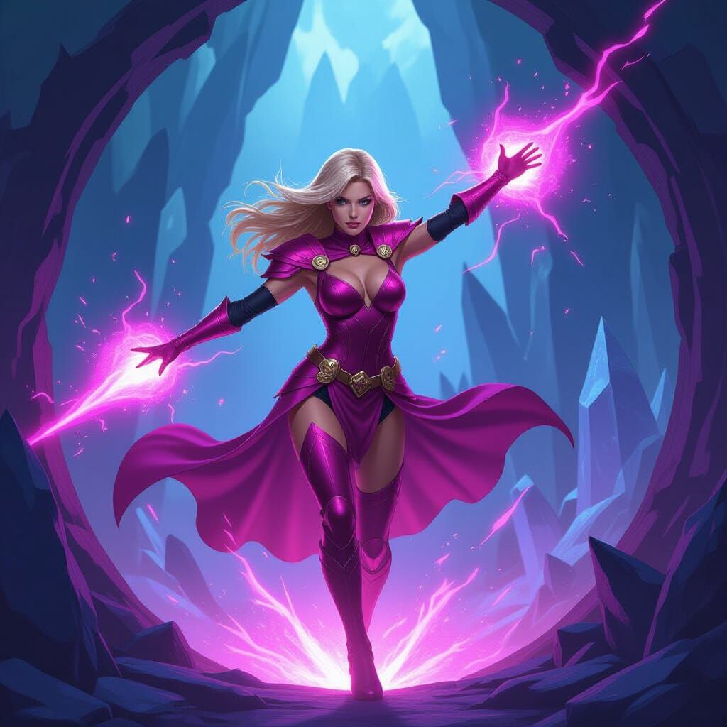 This image shows Sara Jean Underwood as Magik, in crimson armor, leaping through a portal. Magical energy illuminates a dark, otherworldly dimension with crystalline structures. Digital painting with cinematic lighting.