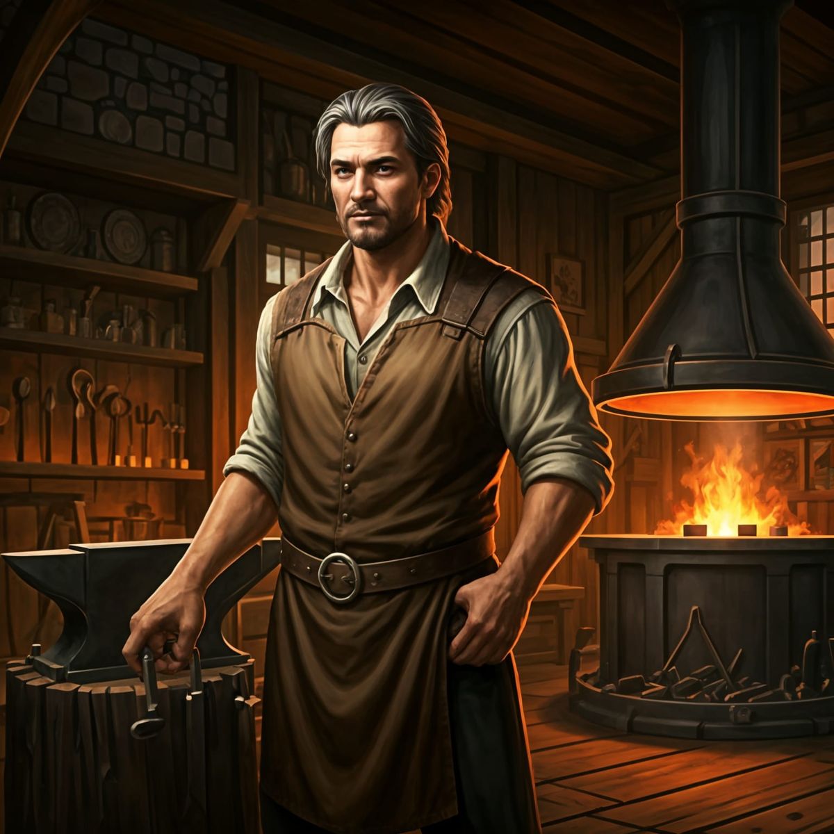 This image shows a 40-year-old merchant blacksmith in a warm and inviting fantasy forge. The scene is set inside a bustling shop, filled with the tools of the trade.