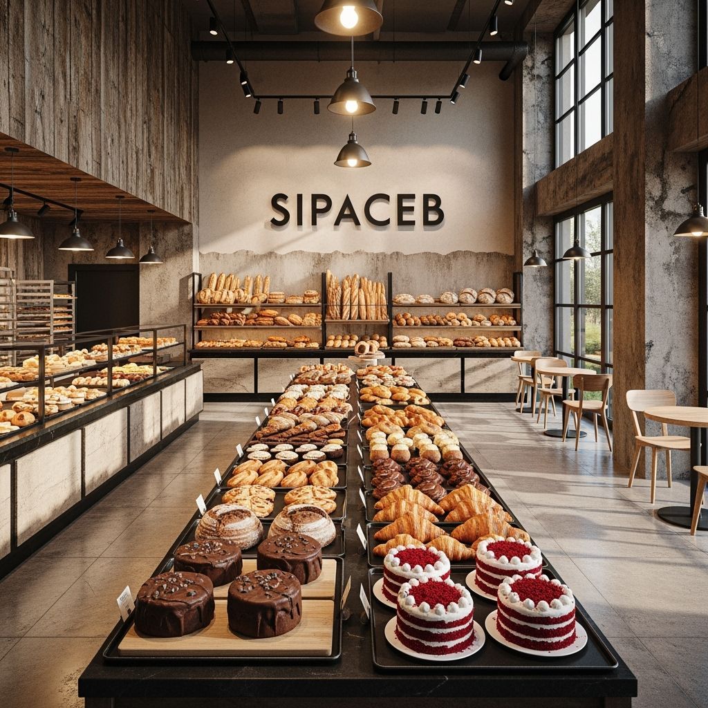 A sunlit bakery interior featuring a counter display filled with breads and pastries. Warm lighting and rustic textures create an inviting atmosphere, reminiscent of aged wood and natural stone in a modern style.