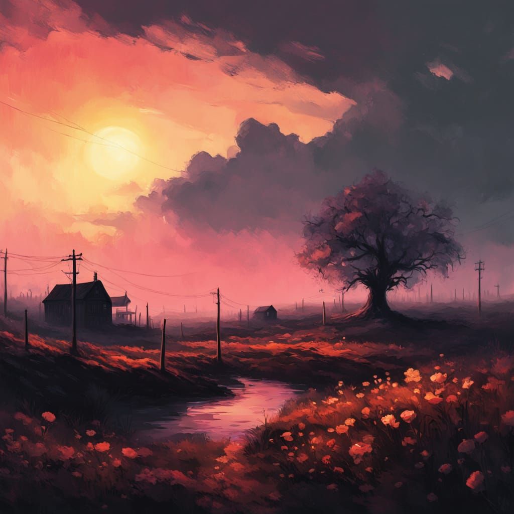 This image showcases vibrant, pastel-hued flowers with delicate petals and morning dew, bathed in the warm, golden light of sunset. A dreamlike atmosphere prevails, with soft focus and long shadows adding to the eerie, surreal ambiance.