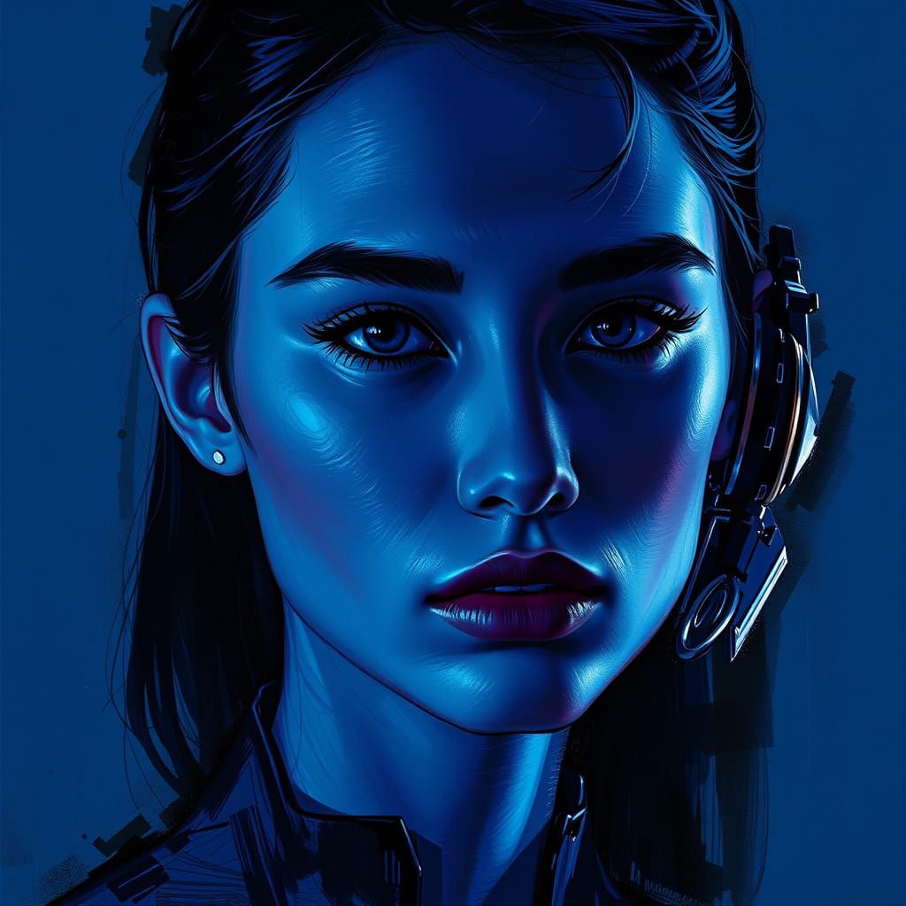 A futuristic image featuring vibrant indigo blue and mysterious black. It showcases bold textures and intricate details, created in a sleek, expressive style.