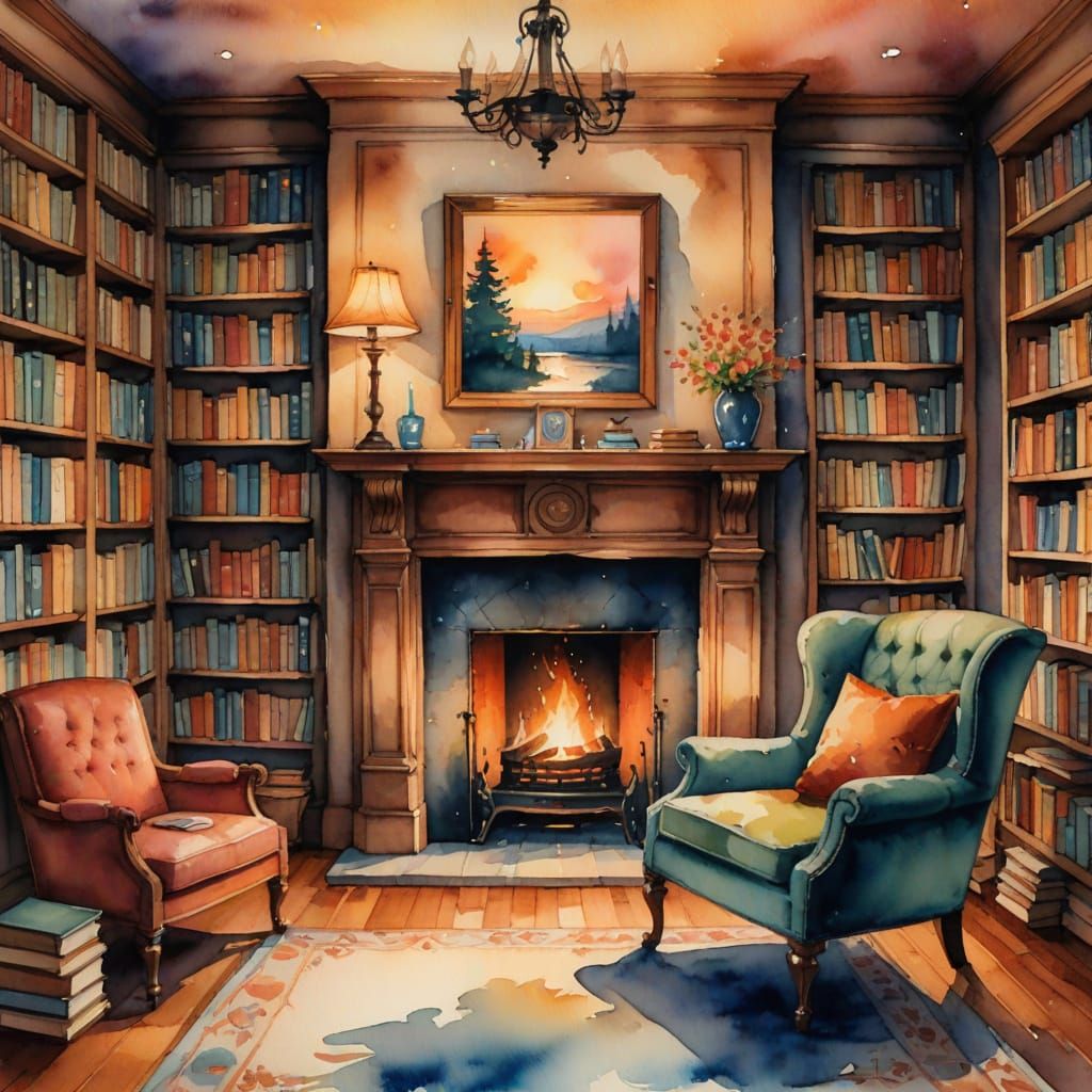 This image shows a warm and inviting library corner featuring a crackling fireplace and a comfortable chair, rendered with whimsical brushstrokes and vibrant colors for a serene atmosphere.