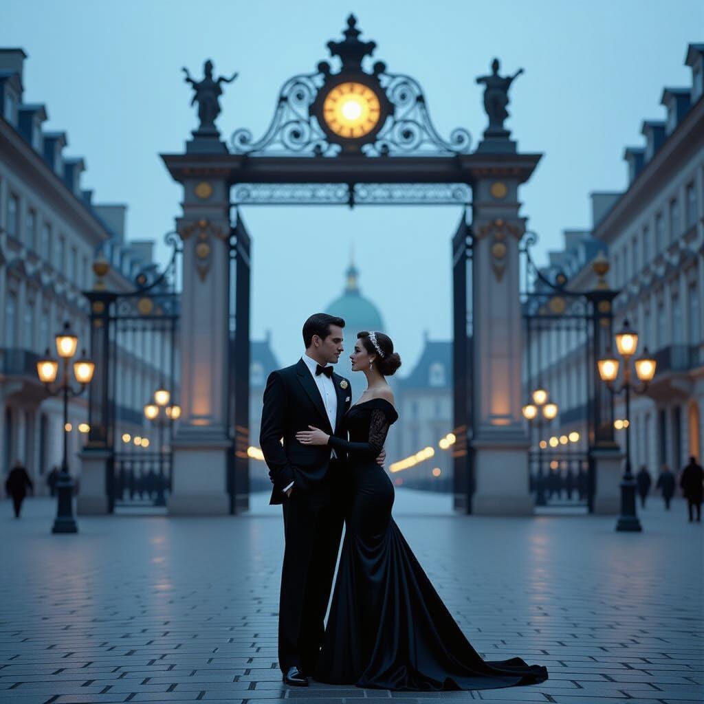 This image shows a sophisticated couple in 1940s attire before a glowing gateway. The scene evokes a film noir aesthetic with soft lighting and opulent art deco details in the style of vintage photography.