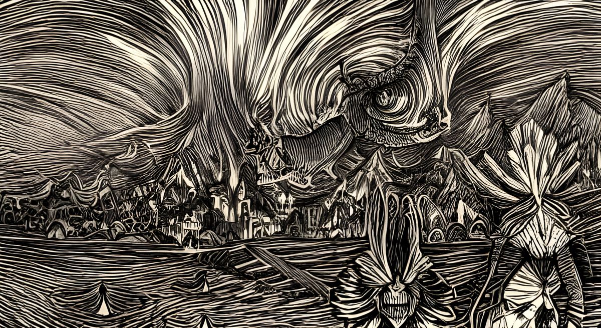 This image features two figures, a man and a woman, merged together in a striking, intricate ink drawing with contrasting colors and an iridescent sheen, creating a sense of ominous depth.