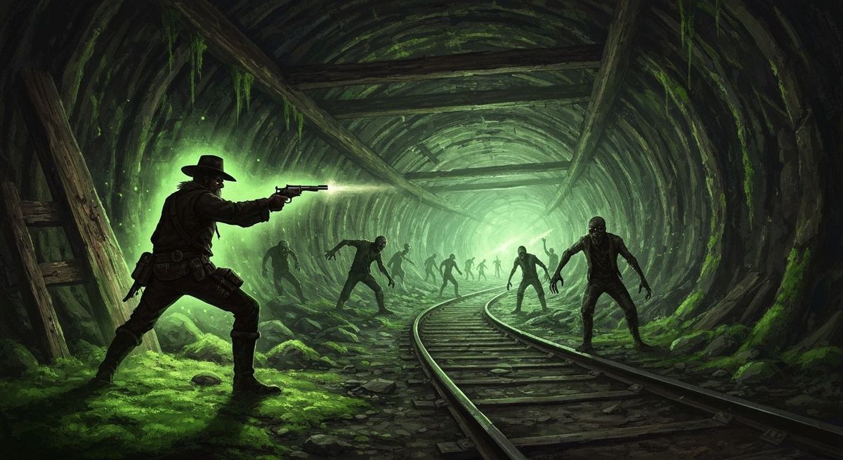 A grizzled gunslinger battles grotesque zombies in a collapsing mine tunnel, illuminated by eerie green moss. Acrylic painting style with dramatic lighting evokes a dark, gothic atmosphere.