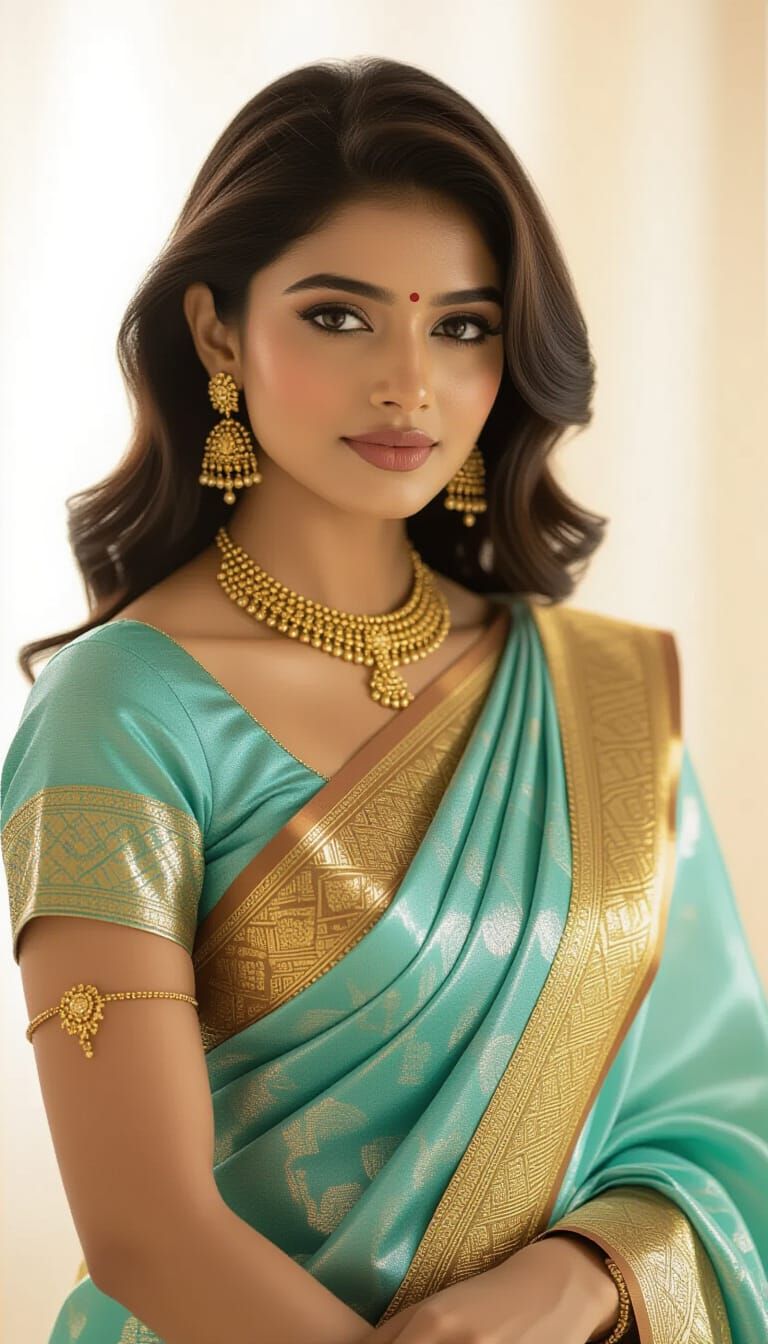 This image shows an Indian woman in a gold and blue Banarasee saree, her skin porcelain and glowing. The portrait is soft-focus and airbrushed, reminiscent of classical painting and modern digital art.