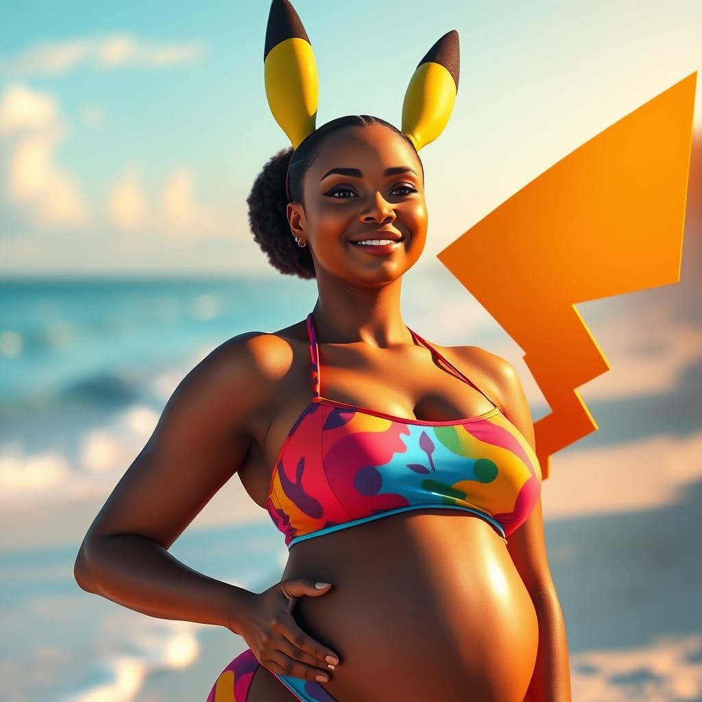 This image captures a serene pregnant woman in a vibrant swimsuit, standing confidently on a sun-kissed beach with a soft bokeh effect in the background. Rendered in a captivating Anime style with bold lines, pastel colors, and digital painting techniques, the portrait exudes radiant elegance and moderni...