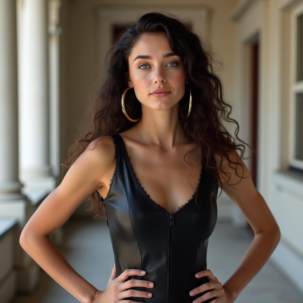 This image shows a young woman posing confidently with a hint of a smile, wearing a fitted black leather dress and gold earrings, set against a classic architectural backdrop with soft, natural lighting accentuating her features.