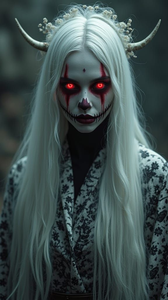 A spectral bride with flowing white hair and striking horror-beauty makeup, featuring red accents and glowing eyes. Her ceremonial robe adds to the haunting, elegant atmosphere.