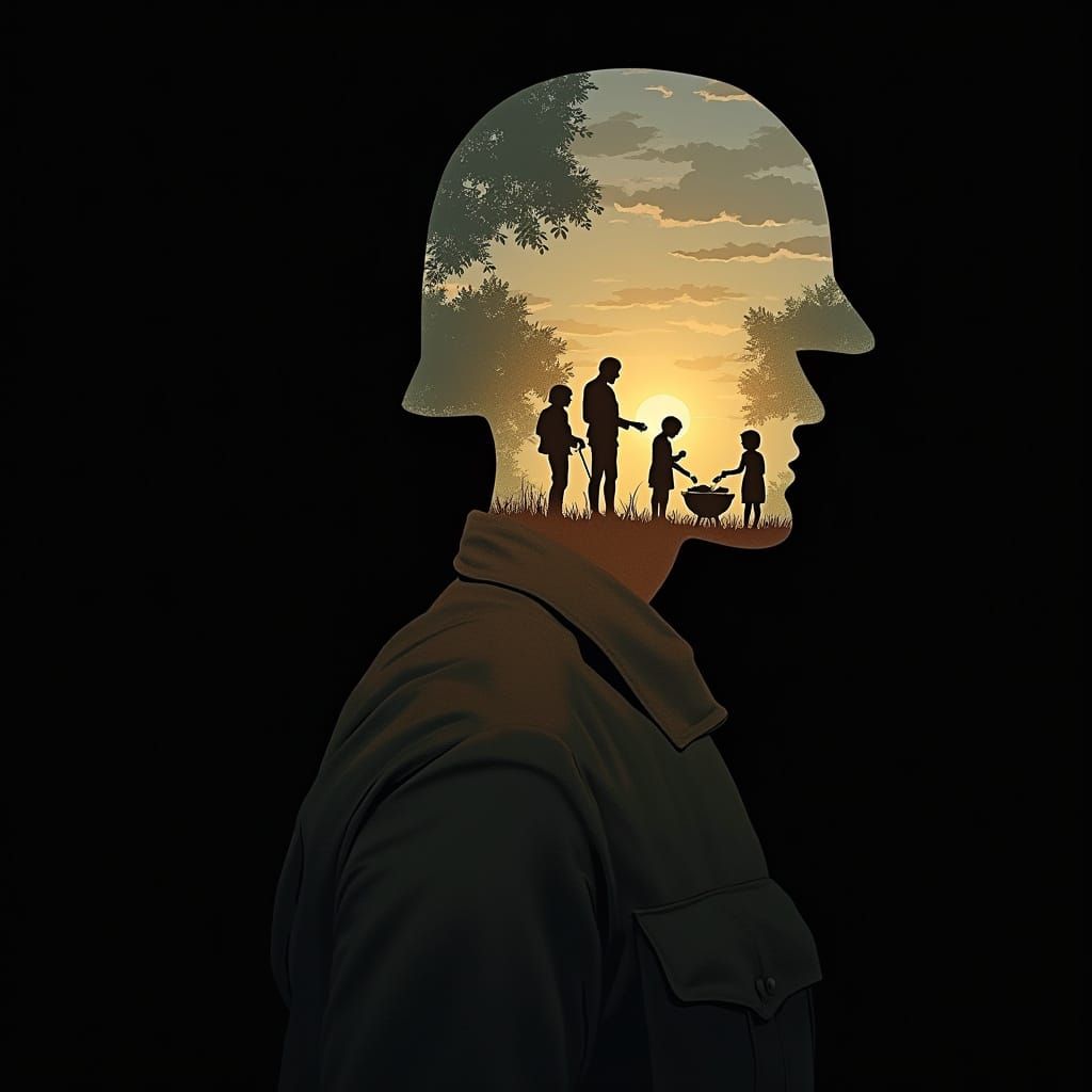 Double exposure illustration for Memorial Day — a somber, thought-provoking scene. A black background sets a respectful tone. The silhouette of a soldier's head and shoulders in full uniform and helmet, stands at attention, facing slightly to the side. Inside the outline of his head, a warm lifestyle ...