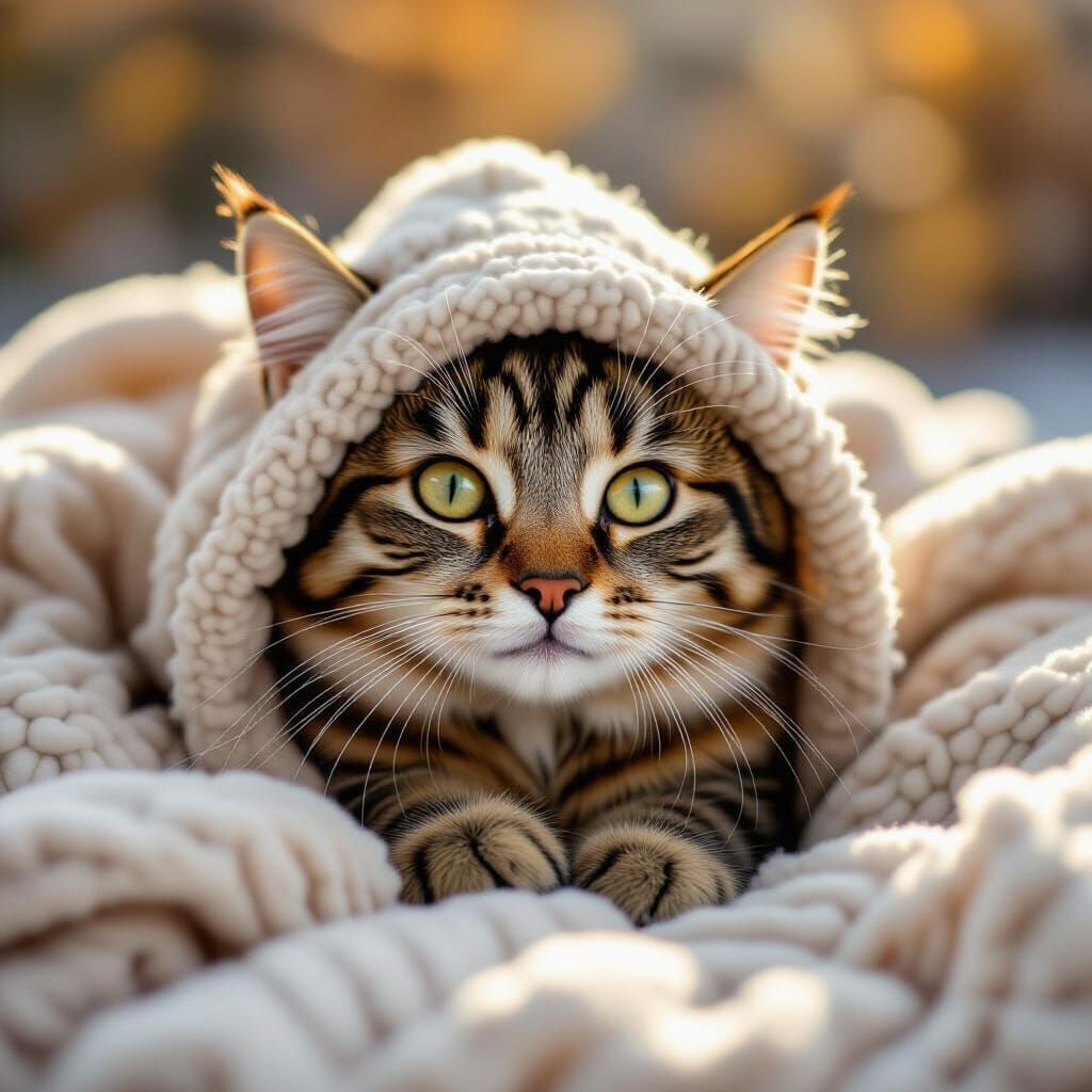 Generate your own happy ginger cat images with soft light and autumn leaves. Free and easy AI image creation.