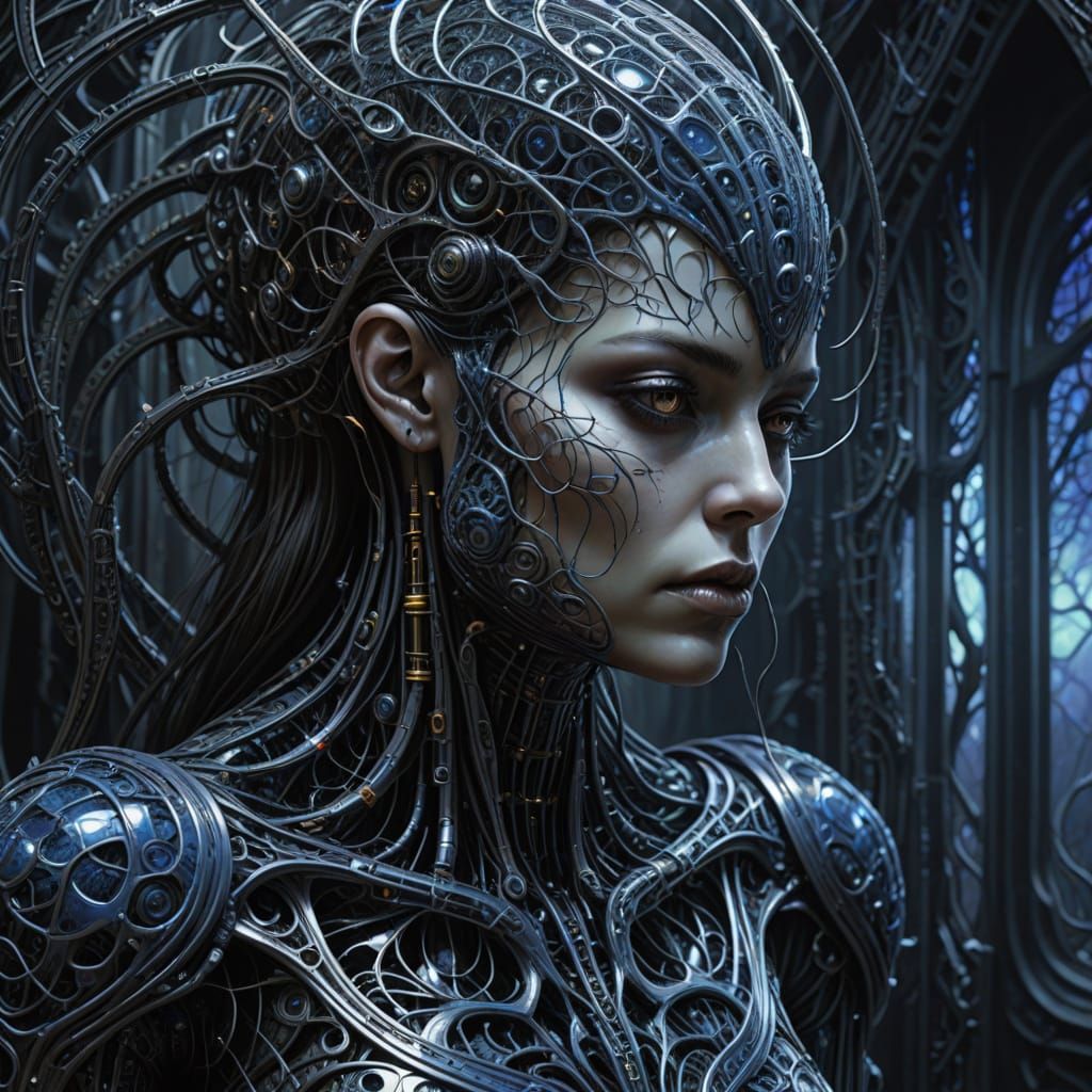 This digital art piece features a close-up of a person lost in thought, exploring virtual realities with intricate fractal patterns and glowing wires. High contrast lighting enhances the unsettling, existential theme.