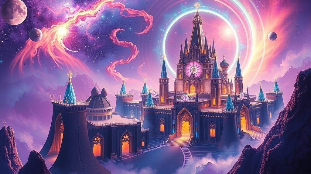 This majestic image depicts a sprawling cosmic fantasy kingdom set against a vibrant, swirling nebula backdrop, adorned with glowing cosmic symbols and artifacts, evoking a sense of wonder and magic in a rich, detailed, and realistic fantasy concept art style reminiscent of 8k resolution matte paintings.