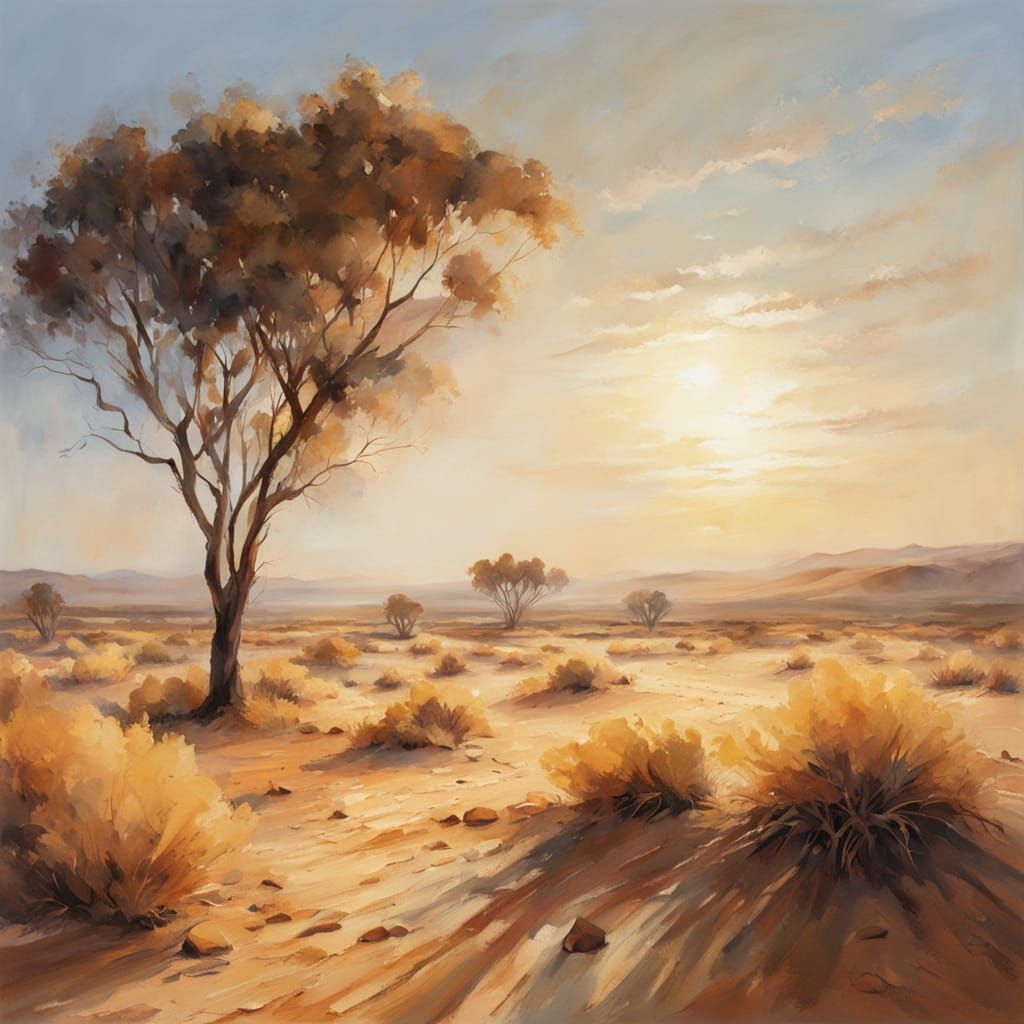 This serene watercolour painting captures the peaceful atmosphere of the Australian outback under a clear blue sky with a lone eucalyptus tree and delicate spinifex grass patterns in the foreground, evoking a sense of natural beauty and idyllic tranquility.