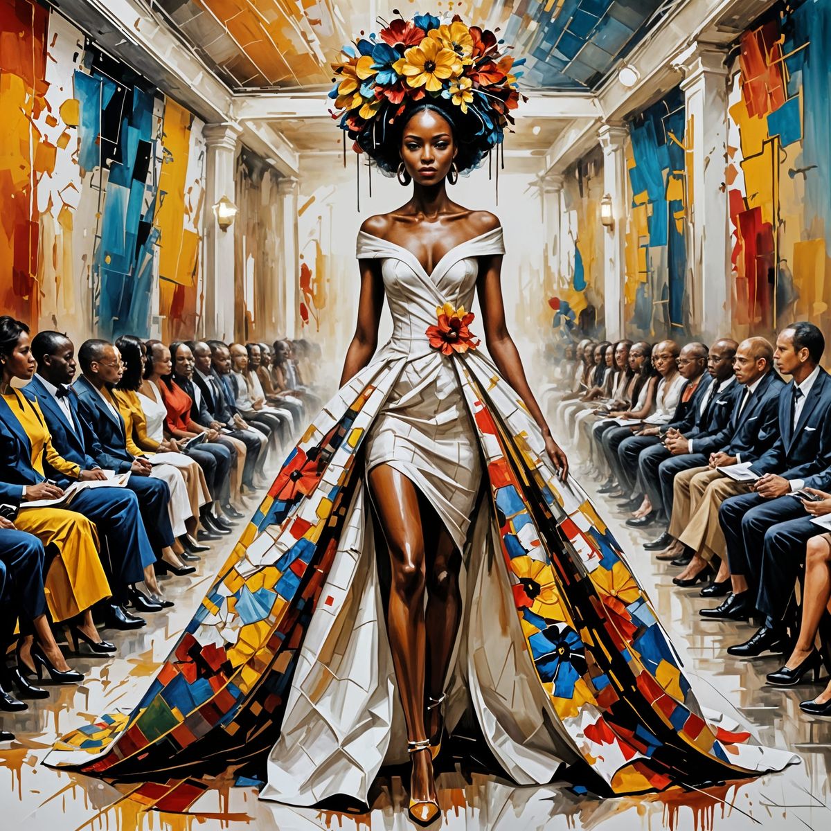This image shows a stunning African woman in an abstract surreal style, walking a catwalk in a luxurious ballroom surrounded by fashionable spectators. She wears an exquisite haute couture gown with intricate floral patterns and textured brushstrokes, reminiscent of fine art and oil painting techniques.