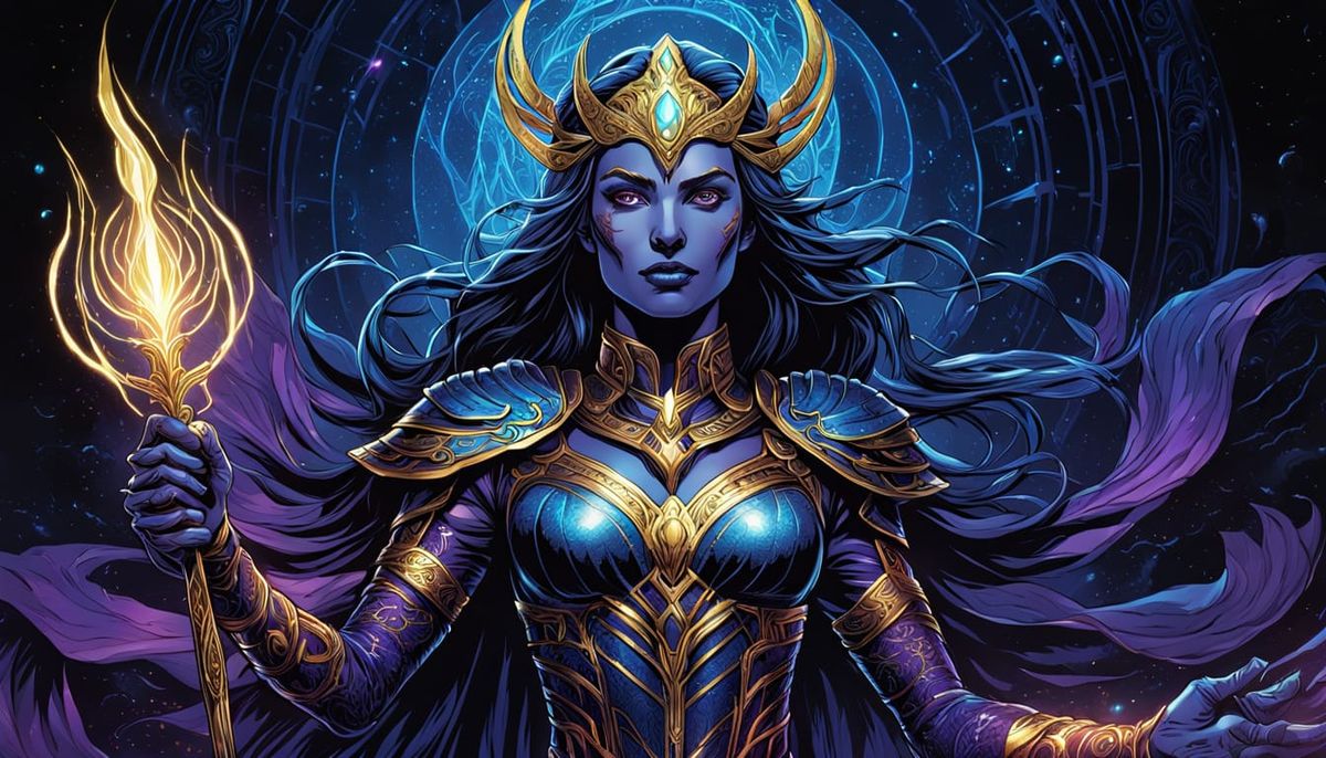 A comic book style image of the goddess Lucidia. She has a glowing aura with purple and blue hues. The digital painting features intricate costume details and high contrast lighting.