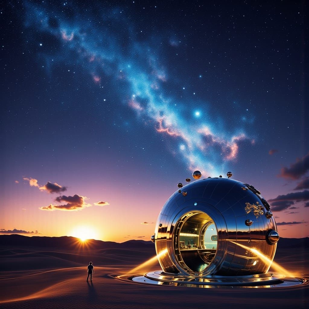 This digital painting shows a solitary person in a chrome observatory gazing at a cosmic desert sky filled with galaxies and starlight, evoking awe and introspection.