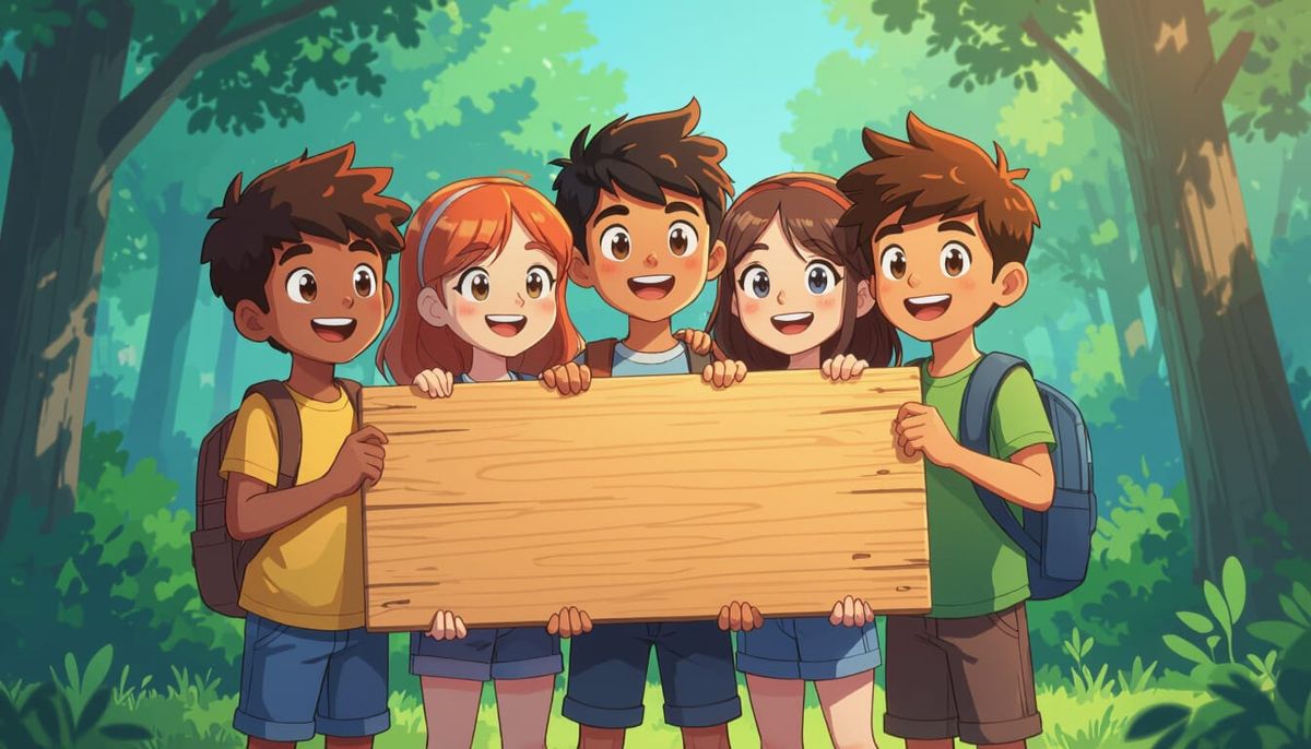A full-body illustration of six cheerful children in vibrant clothes, holding a wooden board. Features cel-shaded animation style with rich colors and detailed textures.