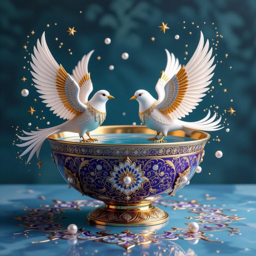 Engraving of oriental paisley ornament on the surface of a silver bowl in which pearl birds sit. Cosmic energy in the form of the smallest colored dust is reflected on the wings of the birds that sing the landscape of Pamukkale, in the background with a golden tint foreground, movement into the depths ...