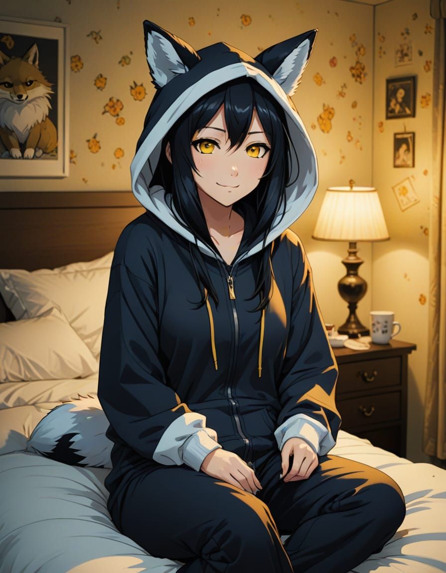 This image shows a girl with long black hair and yellow eyes smiling subtly. She is wearing a fox onesie while sitting on a bed in a dimly lit bedroom, in an anime art style.