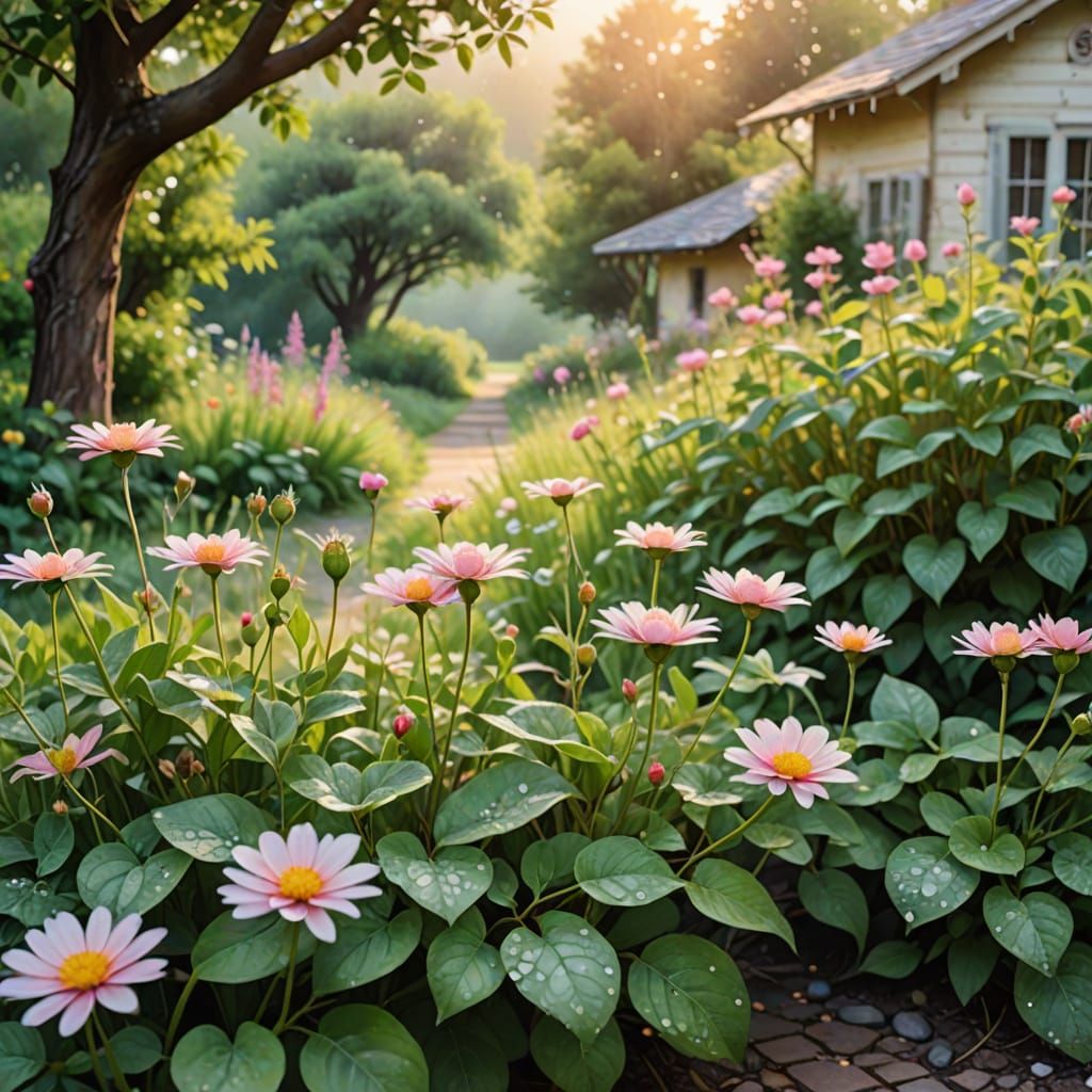 This image depicts a tranquil village scene with lush gardens, chirping birds, and vibrant blooms, set against a warm and sunny backdrop with soft, feathery brushstrokes and gentle pastel hues.