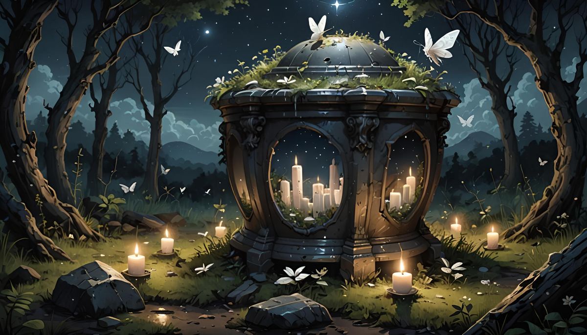 This image shows ancient Roman urns in an overgrown forest at night. Flickering candlelight and luminous moths add to the eerie, magical, haunted ambiance of this landscape painting.