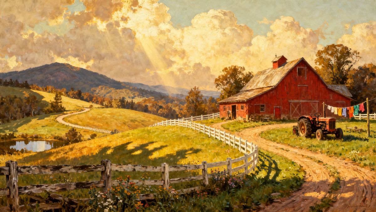 This image captures an idyllic New England farm scene bathed in warm, golden light, reminiscent of classic American illustration.