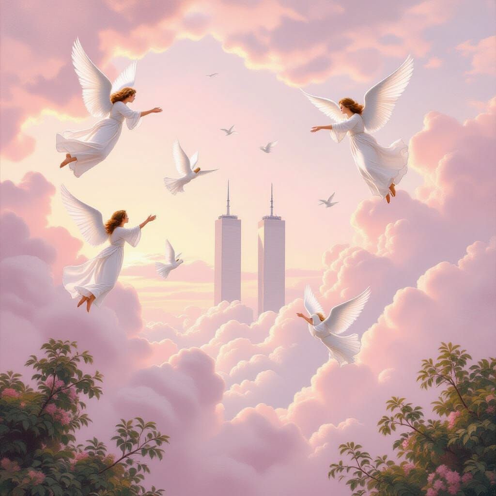 This image shows a peaceful sky with angels and doves near the Twin Towers. The artwork evokes classical elegance, similar to academic paintings with soft, whimsical touches.