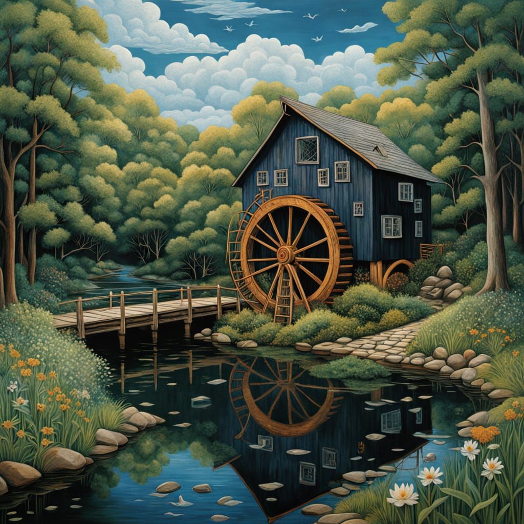 This captivating digital artwork is a mesmerizing blend of nature, spirit, and cosmic elements, featuring a central waterwheel surrounded by intricate textures, serene landscapes, and abstract designs, symbolizing strength, resilience, and the pursuit of authenticity.