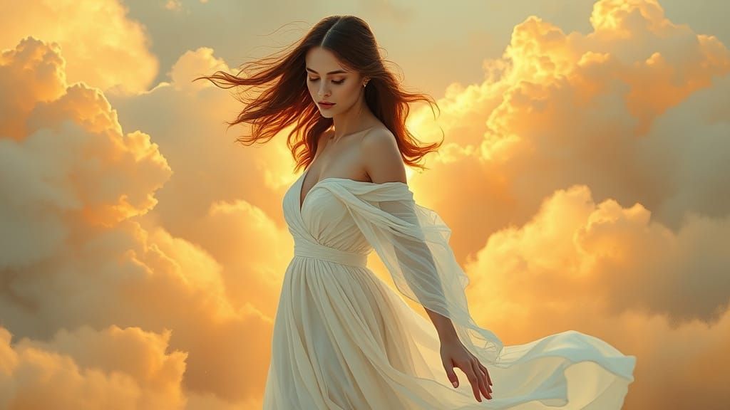 This image shows a serene young woman with flowing brown hair and a white gown, walking gently through a sea of golden clouds, with warm light and ethereal glow surrounding her, blending realism with dreamlike qualities