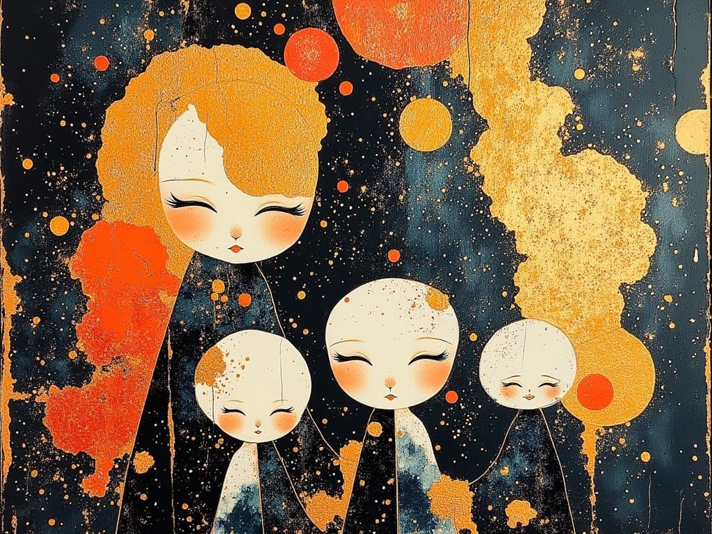 This image shows a family portrait set against a backdrop of fireworks and cherry blossoms. The artwork is rendered in a cubist and expressionist style, using bold colors, layered textures, and abstract elements.