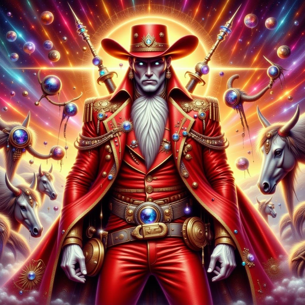 This image depicts Vash the Stampede, a futuristic outlaw, standing confidently with his iconic red coat and golden ornaments, evoking a vibrant cyberpunk western aesthetic.