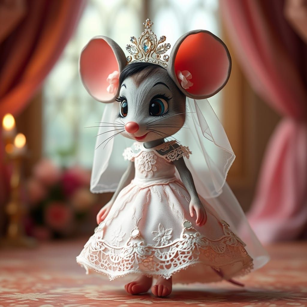 This image shows Mini Mouse in a live-action, fairytale-inspired wedding scene. She wears a pastel pink and white gown with a tiara, in a whimsical, romantic style.