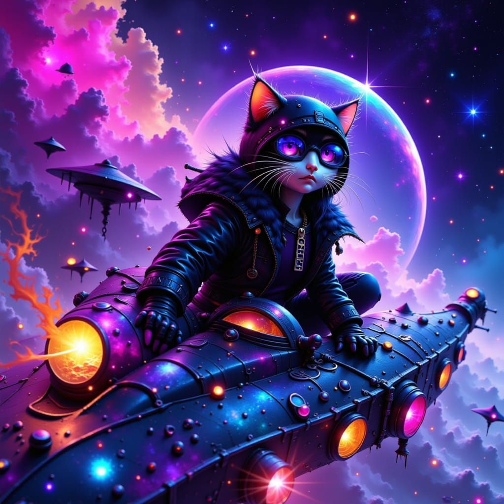 This image shows a cat wearing a leather jacket and goggles piloting a spaceship through a colorful nebula. The digital painting features bright colors and gothic elegance in a celestialpunk aesthetic.