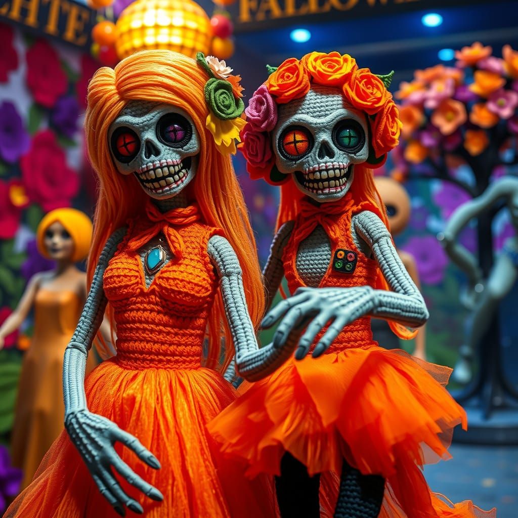 This image showcases stylish undead zombies dancing at a fun, disco-themed prom night. Features include a rainforest, flowers, and a starry sky, rendered in a vibrant, detailed style.