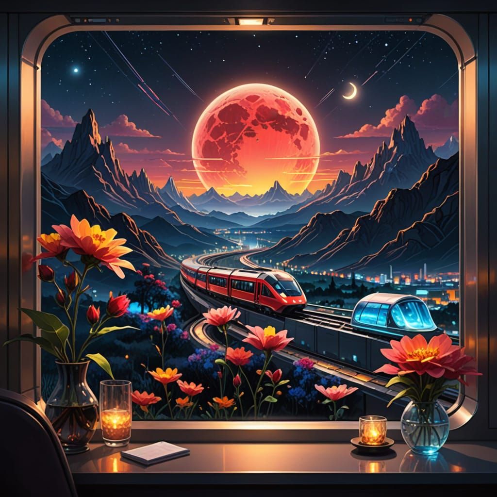 This image depicts a futuristic cityscape at sunset, with neon lights reflecting off translucent mountains and a lone train chugging into the distance. Vibrant flowers bloom in the foreground, set against a starry night sky.